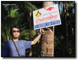 ภาพขวา : นี่ไง มาถึงบ้านทรงไทยแล้ว แต่ก่อนเดินเข้าไปที่ตัวบ้าน ขอถ่ายรูปคู่กับป้ายก่อนนะ |