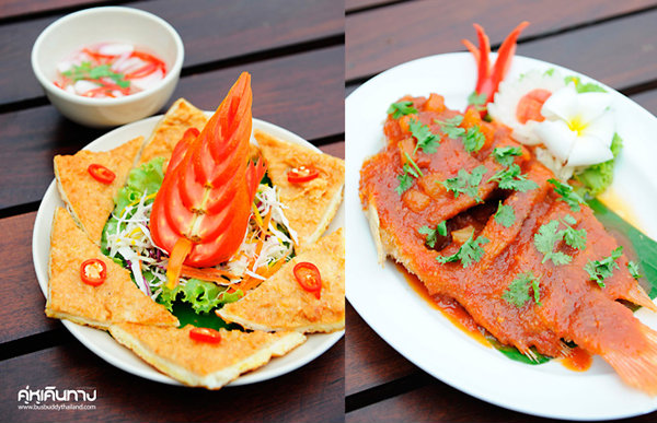 อาหารของที่นี่ก็มีให้เลือกรับประทานหลากหลายเมนูดีครับ ทั้งต้ม ผัด แกง ทอด โดยเฉพาะเมนูปลาต่างๆ ซึ่งถือว่าเป็นเมนูอาหารจานหลักของทางร้าน จานแรกวันนี้ขอเริ่มต้นที่เมนูทานเล่นรองท้องเบาๆ กันก่อน ขนมปังหน้ากุ้ง ที่เสิร์ฟมาพร้อมกับน้ำอาจาด รสชาติดี กรอบนอกนุ่มใน สัมผัสได้ถึงอร่อยของเนื้อกุ้งที่ทางร้านให้มาแบบไม่มีกั๊ก ต่อด้วยเมนู หลนปลาอินทรีย์ นี่ก็เด็ด เครื่องจิ้มเยอะถูกใจมาก ทั้งแคปหมู ขมิ้นขาว ไข่ต้มตานี เหมาะมากสำหรับสาวๆ ที่ต้องการอร่อยแบบน้ำหนักตัวไม่เพิ่ม ตามติดมากับเมนูจานใหญ่ ปลาช่อนเผา 4 ฤดู ที่ว่า 4 ฤดูนี่ก็เพราะมีน้ำจิ้มให้เลือกทั้งหมด 4 แบบ คือ น้ำจิ้มน้ำพริกแมงดา น้ำจิ้มน้ำปลาหวาน น้ำจิ้มซีฟู้ด และน้ำจิ้มแจ่ว แกล้มกับผักสด ผักต้ม ตามฤดูกาล เนื้อปลาหวาน รสชาติอร่อย ไม่ควรพลาด แนะนำกันต่ออีกสักเมนูนึงกับ ปลาทับทิม 3 รส เนื้อปลาทอดกรอบกำลังดี น้ำราดเข้มข้นจัดจ้านได้ทั้ง 3 รสสมชื่อจริงๆ หรือถ้าหากใครชอบปลาชนิดไหนก็สามารถให้ทางร้านดัดแปลงได้ทุกเมนู ไม่ว่าจะเป็นปลาคัง ปลากรด ปลาเนื้ออ่อน หรือ ปลาแรด ก็มี