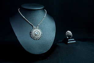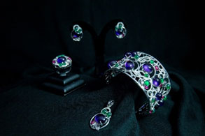 พลอยอเมทิสต์สีม่วงน้ำงาม ล้อมรอบด้วยอัญมณีสีเขียว โดดเด่นอยู่บนตัวเรือนเงิน ซึ่งเป็นการผสมผสานอัญมณีและงานเงินได้อย่างลงตัว
