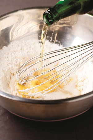 2. ผสมแป้งสาลี แป้งข้าวโพด และผงฟูเข้าด้วยกัน ใส่ไข่ลงไปแล้วใช้ตะกร้อมือคนเบาๆ จนไข่แตก จึงเทเบียร์ลงไปทีละน้อยระหว่างนั้นให้ใช้ตะกร้อมือคนไปเรื่อยๆ จนส่วนผสมเข้ากัน นำไปกรองด้วยกระชอนหนึ่งครั้ง