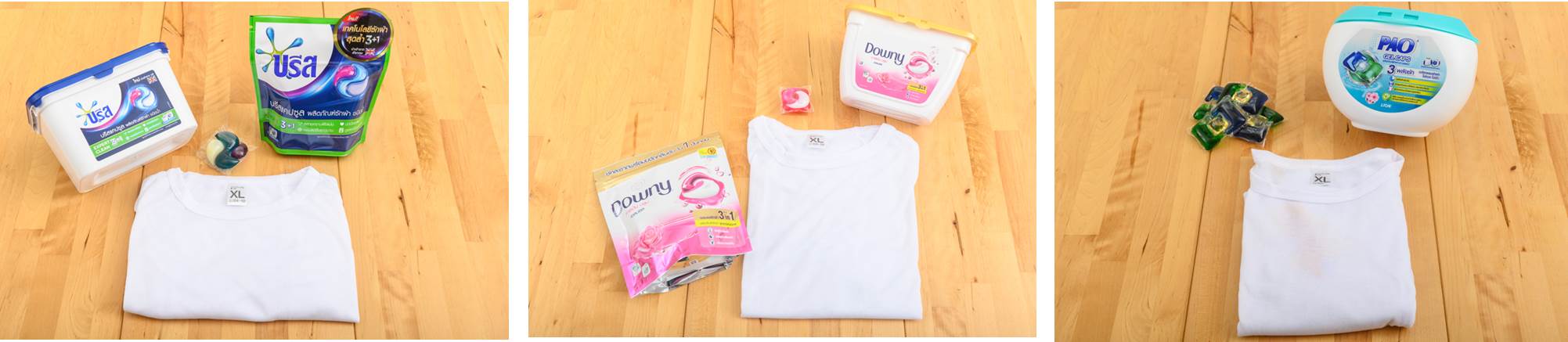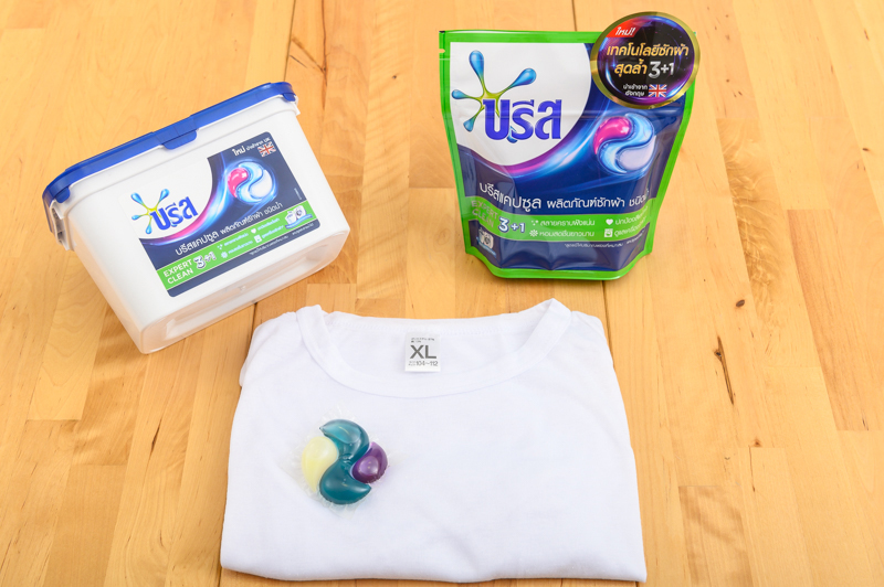 เมื่อได้ลองใช้กันมาแบบยาวๆ จนเริ่มติดใจแคปซูลซักผ้า ทีมงานสนุกก็เลยขอท้าพิสูจน์แคปซูลซักผ้า 3 แบรนด์กันแบบคราบต่อคราบ ชิ้นต่อชิ้น ว่าตัวไหนเด็ดสุดว่าแคปซูลซักผ้าตัวไหนจะกำจัดคราบบนผ้าขาวได้สะอาดกว่ากัน โดยในการพิสูจน์เราลองหยิบจับซอสปรุงรส ซีอิ้วขาว และน้ำอัดลมมาเทรวมกัน แล้วละเลงลงบนผ้าขาว