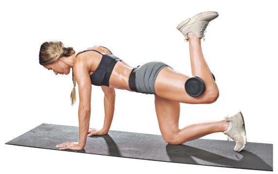 Kickback การคุกเข่าลง และวางฝ่ามือลงบนพื้น โดยวางให้กว้างเท่ากับหัวไหล่ ขยับจนได้ท่าที่มั่นคง จากนั้นยกขาขวาเหยียดตึงไปด้านหลัง ค้างไว้ 5 วินาที แล้วลากกลับมาวางทีเดิม ทำแบบนี้สลับทั้ง 2 ขา เซตละ 30 ครั้ง
