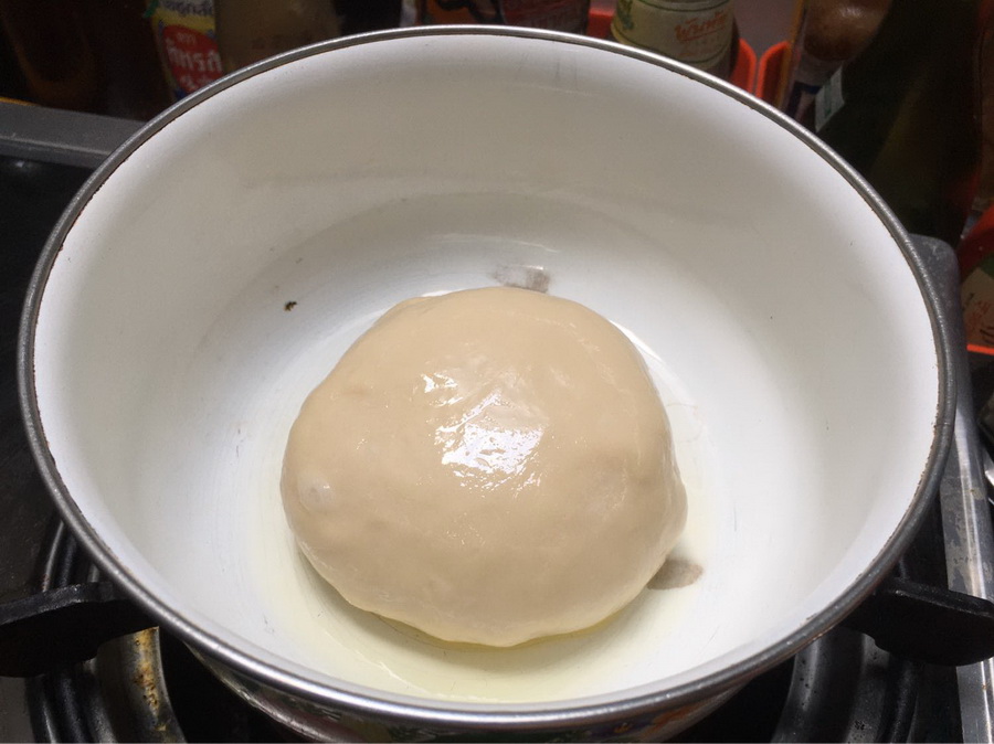 4. นวดนิดนึงให้กลม เอาน้ำมันทาชาม ทาแป้ง เอาแป้งใส่ชามพักแป้ง 1 ชม. 15 นาทีจ้า เอาผ้าหมาดหรือฝาปิดคลุมไว้หน่อยนะเดี๋ยวแป้งแห้ง