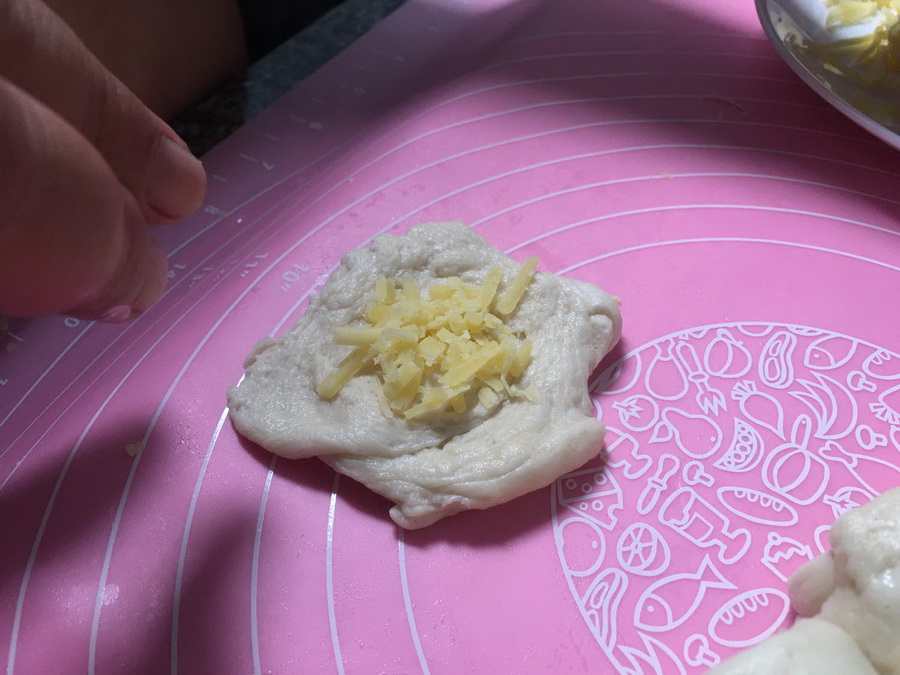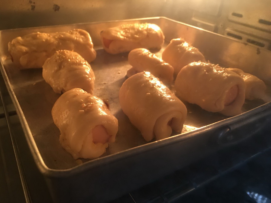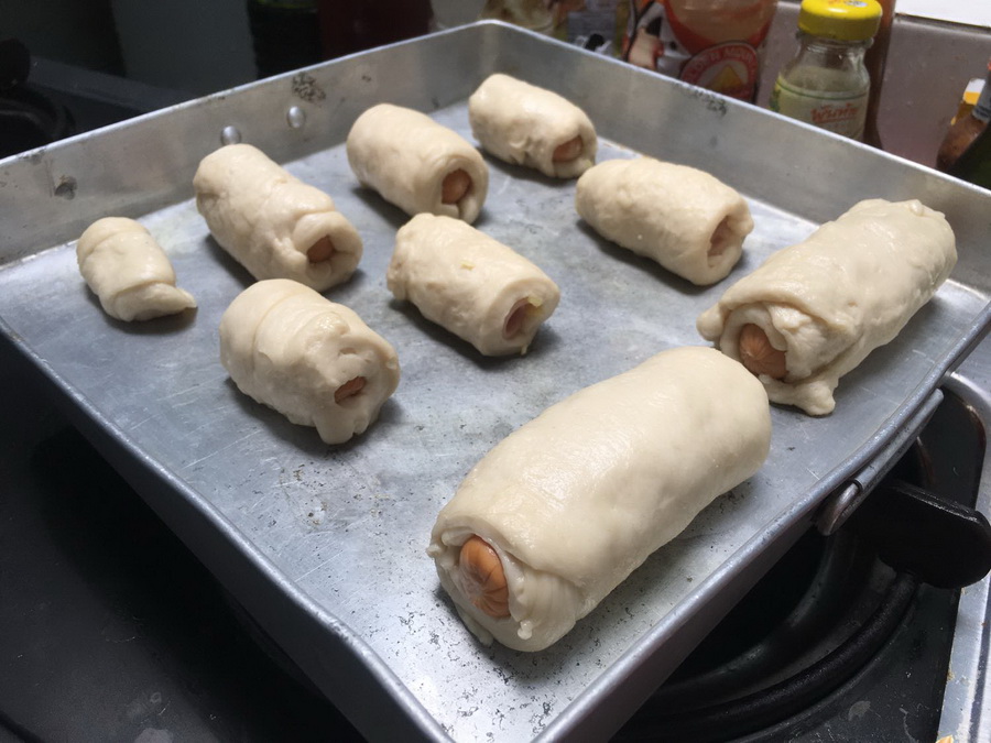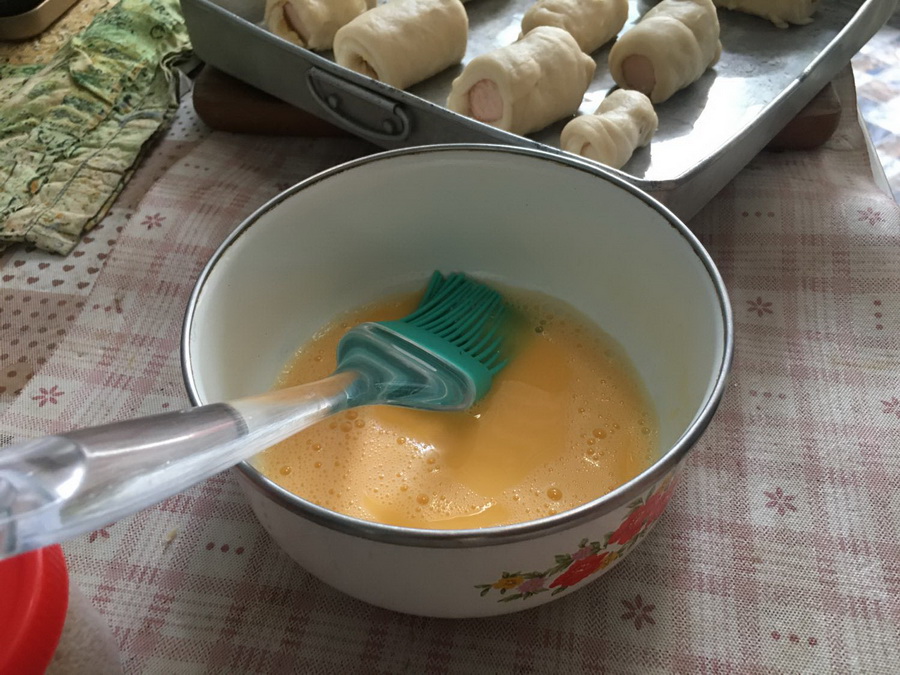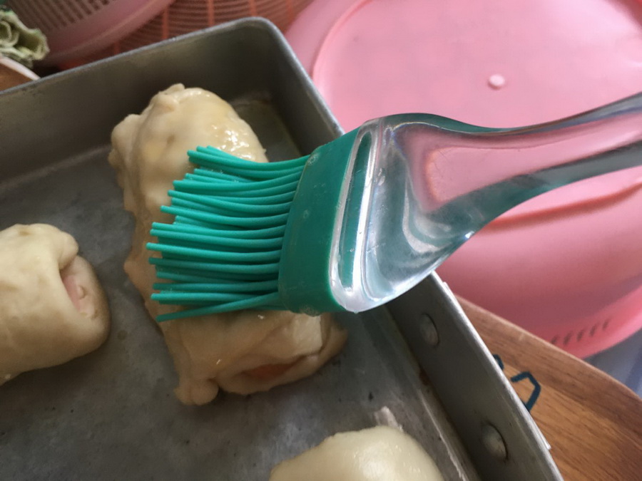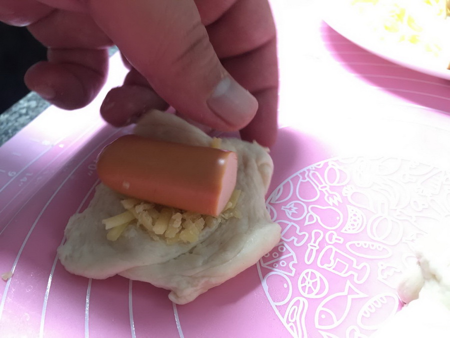 6. พอแป้งได้ที่ แผ่เป็นแผ่น ใส่ไส้กรอก ชีส ม้วนแล้วเอาตะเข็บไว้ด้านล่าง ทาด้านบนด้วยไข่ที่ตีแล้ว พักอีก 15 นาที