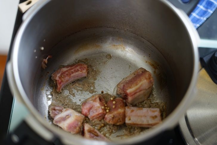 สูตรของแม่ปอมจะใช้หม้อเดิมที่ต้มถั่ว ใส่กระดูกหมูลงไปรวนสุกครึ่งหนึ่ง เพื่อให้หมูที่เราหมักสะดุ้งไฟ เรียกรสชาติความอร่อยออกมา การนำไปรวนก่อนยังทำให้พวกเลือดที่อยู่ในกระดูกไหลออกมาด้วย จึงทำให้เลือดแห้งไปเอง ไม่ทำให้น้ำขุ่น จากนั้นค่อยตามด้วยกระเทียม พริกไทย รากผักชี หัวไชโป๊ว แล้วจึงค่อยๆ เติมน้ำ เคี่ยวไปเรื่อยๆ จนหมูเปื่อยเป็นอันใช้ได้