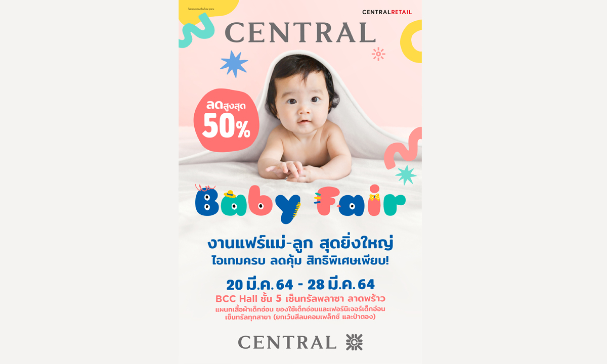 ห้างเซ็นทรัล จัดงาน “Central Baby Fair” (เซ็นทรัล เบบี้ แฟร์) ยกขบวนสินค้าแผนกเสื้อผ้า ของใช้ และเฟอร์นิเจอร์เด็กอ่อน ให้คุณพ่อคุณแม่ได้ช้อปฯ สินค้าเพื่อลูกรักแบบจุใจเป็นครั้งแรกของปี พร้อมโปรโมชั่น ลดสูงสุด 50 % และสิทธิพิเศษมากมายรวมกว่า 2 ล้านบาท ตั้งแต่วันที่ 20 – 28 มี.ค. 64 ที่ BCC Hall ชั้น 5 ศูนย์การค้าเซ็นทรัลพลาซา ลาดพร้าว