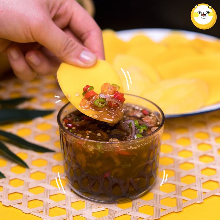 2. ใส่หอมแดง พริกขี้หนูซอย และเป็นเม็ดลงไป คนให้เข้ากัน จากนั้นปิดไฟพักให้เย็น ตักใส่ถ้วยกินคู่กับมะม่วง