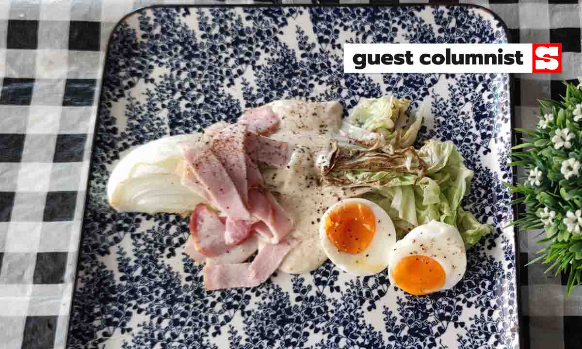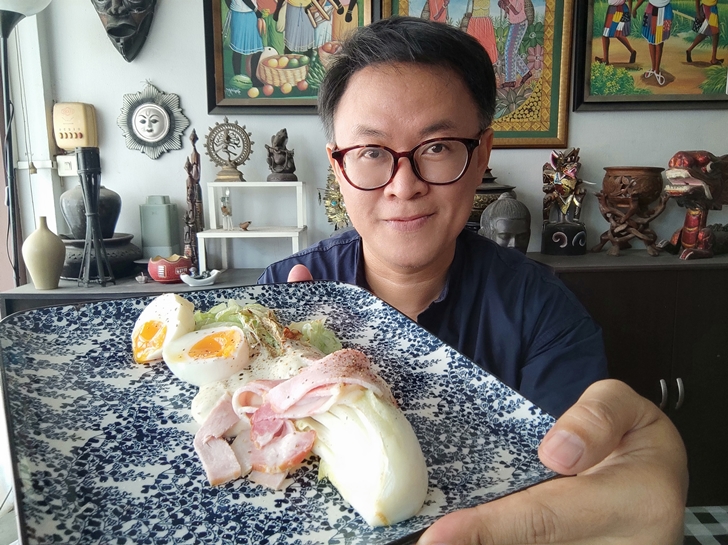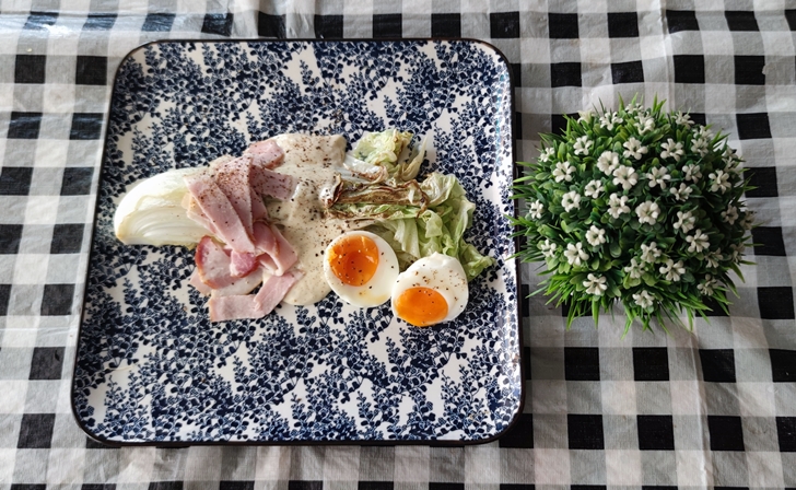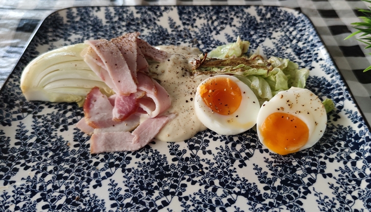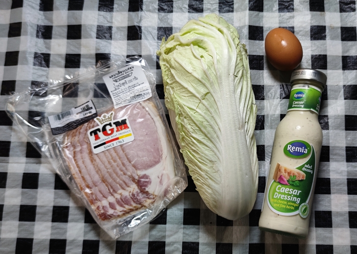 - วางใส่จาน ราดน้ำสลัด ใส่เบคอน และไข่ โรยเกลือ พริกไทย เป็นอันเสร็จง่ายนิดเดียวครับ
