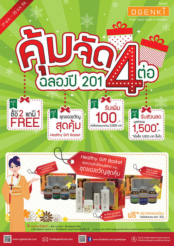 ร้านโอเกนกิ ร้านเพื่อสุขภาพและความงามสไตล์ญี่ปุ่น ฉลองปีใหม่ 2014 ด้วยโปรโมชั่นคุ้มจัดประหยัด 4 ต่อ เพื่อช้อปเตรียมสวยไปลัลล้าเคาน์ดาวน์รับปี 2014 กันค่ะ