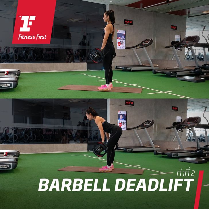 - ยืนเท้ากว้างเท่ากับช่วงสะโพก จับบาร์เบลที่ด้านหน้า ให้มือที่จับบาร์เบลกว้างที่ระยะห่างจากต้นขาประมาณหนึ่งนิ้วโป้ง