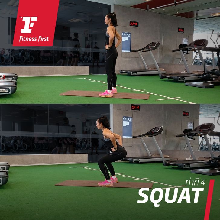 - ย่อเข่า ดันก้นไปด้านหลัง แล้วค่อยๆ ดันตัวขึ้น ที่สำคัญหัวเข่าและปลายเท้าต้องไปแนวทางเดียวกัน ความรู้สึกเหมือนเราออกแรงฉีกพื้นออกจากกัน ทำซ้ำ 20-25 ครั้งเท่ากับ 1 เซ็ต ฝึกประมาณ 3-5 เซ็ต