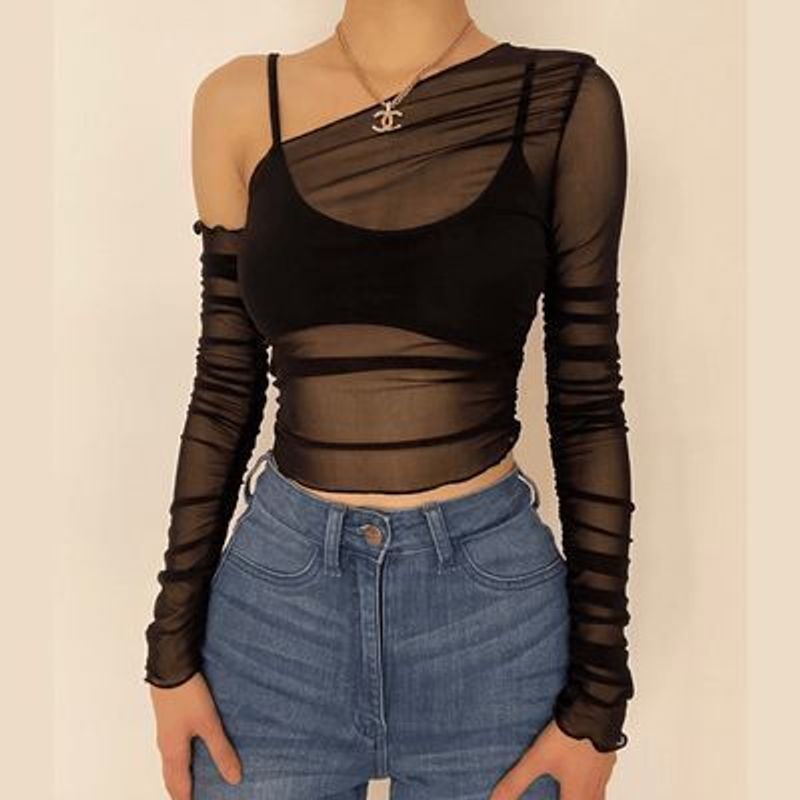 มาดูลุคแนวสตรีทกันบ้างกับ เสื้อซีทรูสวมทับกับสายเดี่ยวครอปสีดำ พร้อมแมทช์ด้วยกางเกงเอวสูงสีดำเช่นกัน ฟินิชลุคเก๋อีกหนึ่งด้วยเข็มขัดซักเส้น เริ่ดค่ะซิส