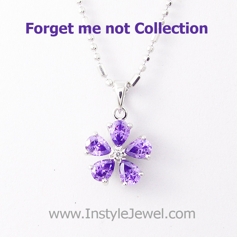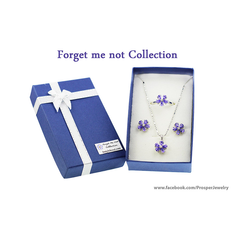 “จากสีที่เป็นเอกลักษณ์ของดอก Forget me not ทางบริษัทได้คัดสรรพลอยหลากหลายชนิด และในที่สุดได้พบว่าพลอย Cubic Zirconia สีม่วงพิเศษ มีลักษณะใกล้เคียงกับสีของดอก Forget me not มากที่สุด จึงนำมาเจียระไนโดยช่างฝีมือของเรา เพื่อให้เกิดประกายแวววาวสูงสุด และนำมาประดับลงบนตัวเรือนเงินแท้ 92.5% ฝังโดยช่างฝีมือผู้ชำนาญการด้วยความปราณีต เพื่อให้ได้แหวนที่มีคุณค่า เหมาะแก่การมอบให้กับคนที่คุณรัก”