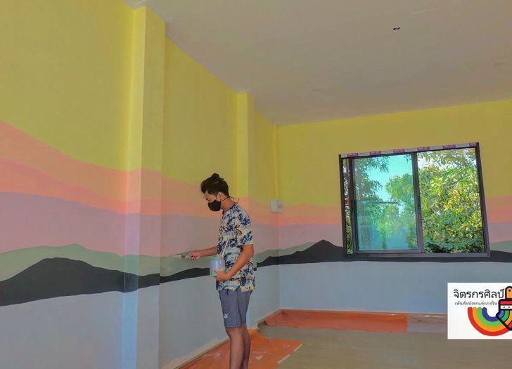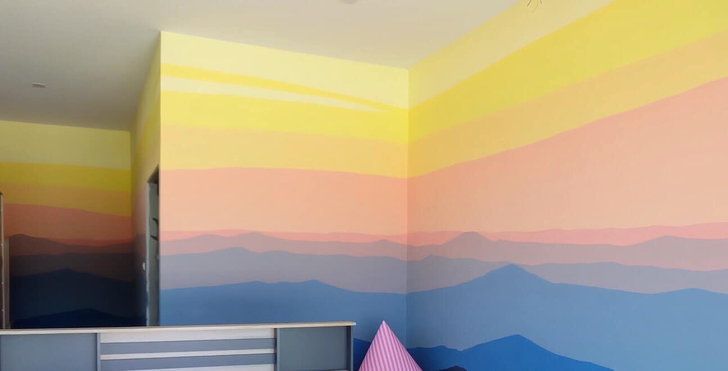 เมื่อลงสีเสร็จก็จะได้เป็นภาพภูเขาและแสงยามเย็นที่นอกจากจะสร้างบรรยากาศให้ห้องสวยขึ้นแล้ว ยังทำให้มุมห้องหายไปอีกด้วย นับว่าเป็นไอเดียที่น่าสนใจดีเหมือนกันนะเนี่ย