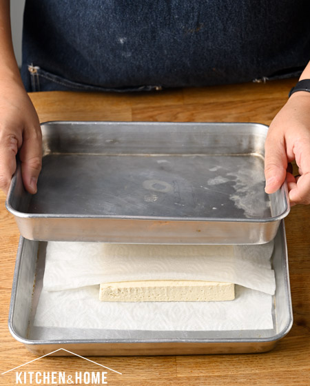1.ปูกระดาษทิชชู pepper towel บนถาด วางเต้าหู้โมแมนลงไป ปูทับด้วยกระดาษทิชชู paper towel ด้านบน วางทับด้วยถาดก้นลึกใส่น้ำ หรือ วางกระป๋องหรือ ขวดแก้วหนักทับไว้ ประมาณ 30 – 40 นาที
