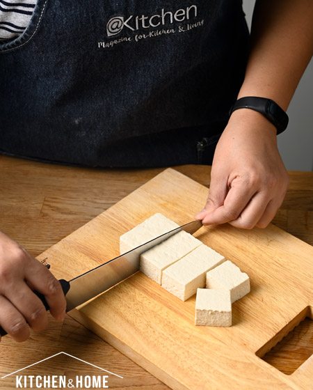 2.นำเต้าหู้มาตัดขนาดตามต้องการ เปิดเตาอบที่อุณหภูมิ 180 – 200 องศาเซลเซียส