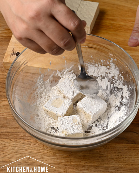 3.ผสมแป้งข้าวโพด เกลือ ผงกระเทียม พริกไทย และ ผงหอมหัวใหญ่ คนให้เข้ากัน แล้วเอาเต้าหู้ลงไปคลุกให้ส่วนผสมแป้งเคลือบเต้าหู้ จนทั่วชิ้น