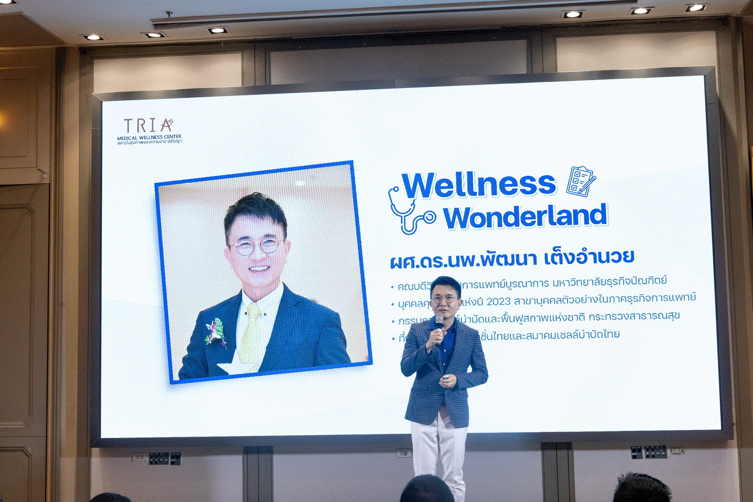 ผศ.ดร.นายแพทย์ พัฒนา เต็งอำนวย บุคคลคุณภาพแห่งปี 2023 สาขาบุคคลตัวอย่างในภาคธุรกิจการแพทย์ และคณบดีวิทยาลัยการแพทย์บูรณาการ มหาวิทยาลัยธุรกิจบัณฑิต บรรยายถึงเรื่อง “ สุขภาพดี ไม่ได้มีแค่ตรวจสุขภาพ”ว่าการตรวจสุขภาพในปัจจุบัน ไม่ได้มีประโยชน์องค์รวมต่อการวิเคราะห์ว่าคุณมีสุขภาพดี จริงๆองค์รวมของการตรวจสุขภาพดีมันมีเยอะ อารมณ์ไม่ดี คือสุขภาพไม่ดี ตกงานคือสุขภาพไม่ดี มีแฟนไม่ดีคือสุขภาพไม่ดี สิ่งแวดล้อมไม่ดี คือสุขภาพไม่ดี ทุกสิ่งทุกอย่างมีผลต่อสุขภาพทั้งสิ้น