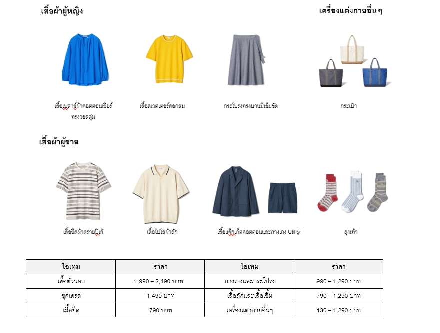 ไลน์อัพ: 7 ไอเทมสำหรับผู้หญิง 8 ไอเทมสำหรับผู้ชาย และ 2 ไอเทมสำหรับเครื่องแต่งกายอื่นๆ