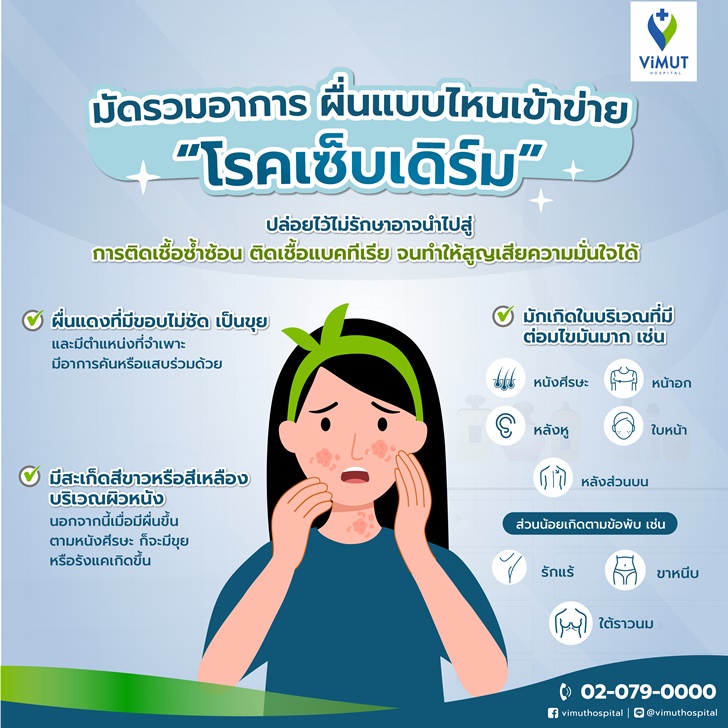 ปฏิเสธไม่ได้ว่าการมีผิวพรรณที่ดูดีสะอาดสะอ้าน ก็ถือว่ามีชัยไปกว่าครึ่ง เพราะนอกจากจะช่วยเสริมสร้างบุคลิกแล้วยังช่วยให้เราทำสิ่งต่าง ๆ ได้อย่างมั่นใจอีกด้วย แต่บางครั้ง แม้ว่าเราจะดูแลตัวเองอย่างดีแล้ว ผิวกลับมีผื่นแดงผิดปกติขึ้นหลายจุด แถมยังมีอาการแสบคันร่วมด้วย ซึ่งอาจเป็นอาการของ "โรคเซ็บเดิร์ม" ที่มักเกิดขึ้นบริเวณที่มีต่อมไขมันอยู่มาก โดยนอกจากจะสร้างความรำคาญและทำให้สูญเสียความมั่นใจแล้ว หากไม่รักษาให้ดี ผื่นอาจลุกลามจนเกิดอาการแทรกซ้อน วันนี้ พญ.สุธาสินี ไพฑูรย์วัฒนกิจ แพทย์ผู้ชำนาญการด้านผิวหนัง ศูนย์ผิวหนังและความงาม รพ.วิมุต จะมาอธิบายลักษณะของโรคเซ็บเดิร์ม พร้อมวิธีการป้องกันและรักษา เพื่อให้ผู้ที่เป็นโรคนี้รับมือกับอาการให้ดีและกลับมาใช้ชีวิตได้อย่างมั่นใจ