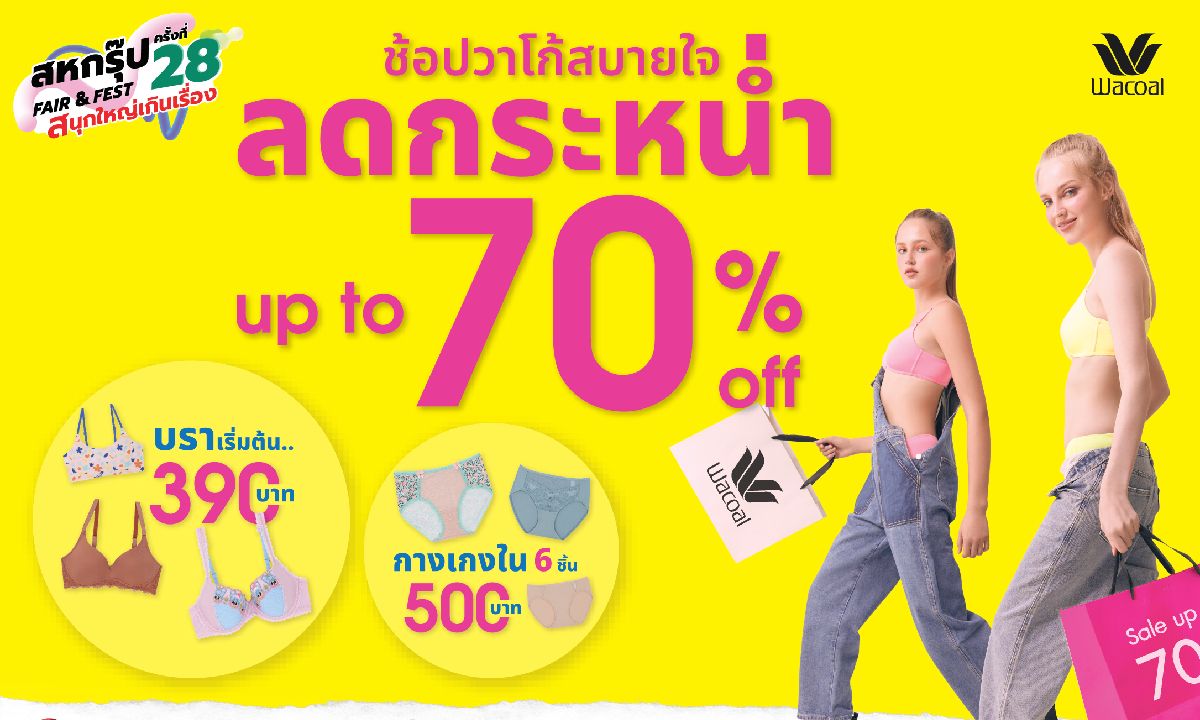 วาโก้ เอาใจขาช้อปชวนมาจับจ่ายแบบสบายอก สบายใจ พร้อมขนทัพสินค้าคุณภาพมาจัดโปรโมชั่นลดราคาสูงสุด 70% ในงานสหกรุ๊ปแฟร์ ครั้งที่ 28 โดยปีนี้ วาโก้มาในคอนเซ็ปต์ WACOAL BRACATION ให้ทุกวัน เป็นวันสบายยย.. สบายอก ด้วยทั้งเนื้อผ้านุ่มสบาย สบายใจ ด้วยราคาที่เข้าถึง สบายโลก เพราะวาโก้ทุกชิ้นผ่านกระบวนการผลิตที่เป็นมิตรต่อสิ่งแวดล้อม โดยความพิเศษของปีนี้ วาโก้ยังเปิดตัวคอลเลกชันใหม่ Wacoal Soft Flex มีดีมากกว่านุ่ม คือนุ่มที่กระชับเอาเรื่อง! พร้อมเปิดตัวมาสคอต “พี่นุ่มนิ่ม” เป็นครั้งแรกในงานนี้ อีกหนึ่งไฮไลท์ที่ไม่ควรพลาดกับวาโก้แฟชั่นโชว์ ภายใต้คอนเซ็ปต์ “Wacoal Bracation Fashion Show 2024” พร้อมเยี่ยมชมเอ็กซิบิชั่นที่บูธวาโก้ นำเสนอคอลเลกชันในปี 2024 ได้แก่ WACOAL SOFT FLEX, WACOAL MOOD ONE SIZE FITS ALL, WACOAL MOOD BUDDY BRA,WACOAL MOTION x WINNIE และ WACOAL BLOOM เพราะวาโก้เป็นแบรนด์ชุดชั้นใน อันดับ 1 สำหรับทุกคน ทุกวัย ทุกไซซ์ ทุกคัพ ระหว่างวันที่ 27 มิถุนายน 2567 – 30 มิถุนายน 2567 ณ ไบเทค บางนา ฮอลล์ 98-100
