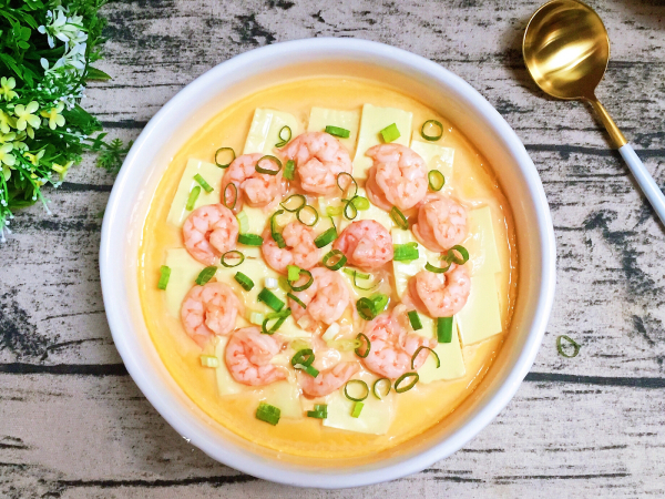 แกะเปลือกกุ้ง ผ่าหลังเอาเส้นดำออก หมักกับขิงและเหล้าเพื่อลดกลิ่นคาว ตีไข่กับน้ำในอัตราส่วน 1:1.5 กรองฟองออก หั่นเต้าหู้เป็นแผ่นเรียงในถ้วย เทไข่ลงไป นึ่ง 8 นาที เปิดฝาเรียงกุ้งลงบนหน้า แล้วนึ่งต่ออีก 3 นาที ราดซอสซีอิ๊ว โรยต้นหอม -