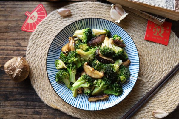 ล้างบรอกโคลีกับน้ำเกลือ แล้วลวกเร็ว 1 นาทีเพื่อรักษาสี เห็ดหอมหั่นบาง ผัดแห้งให้คายน้ำ จากนั้นผัดกระเทียม ใส่เห็ดตามด้วยบรอกโคลี ผัดเร็วด้วยไฟแรง ปรุงรสด้วยซอสหอยนางรมและเกลือเล็กน้อย -