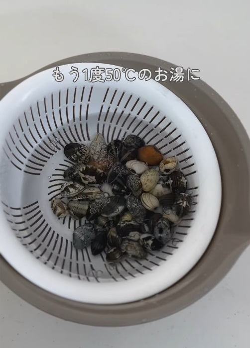 เคล็ดลับคือใช้ชามใส่น้ำอุ่นแล้ววางตะแกรงซ้อนด้านใน ก่อนนำหอยลงไป จะช่วยให้สะดวกและจัดการง่ายขึ้นมาก