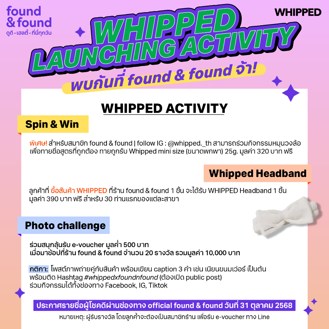 found & found จัดกิจกรรมสุดเอ็กซ์คลูซีฟ ฉลองเปิดตัว “WHIPPED” สูตรวีแกน ลุ้นรางวัลสุดฟินกว่า 800 ชิ้นfound & found จัดกิจกรรม ฉลองเปิดตัวการวางจำหน่าย “WHIPPED” พร้อมลุ้นรางวัลสุดฟินกว่า 800 ชิ้น
