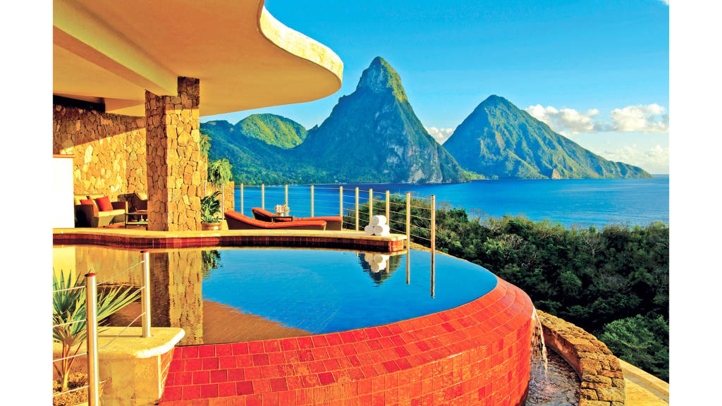 Jade Mountain, Saint Lucia โรงแรมนี้จะมีผนังเพียงอันเดียวที่ทอดยาวและเป็นแบบ open มีสระว่ายน้ำแบบ infinity นอกจากนั้นแล้วโรงแรมยังตั้งอยู่บนเนินเขาต่างระดับ ก้อนหินที่ซิกแซกตามทางเดิน สระน้ำเล็กๆกระจายอยู่ทั่วไป บาร์ของที่นี่ยังตั้งอยู่ที่จุดสูงสุดของเนินเขาด้วย ราคา 1,025 ดอลล่าร์ต่อคืน