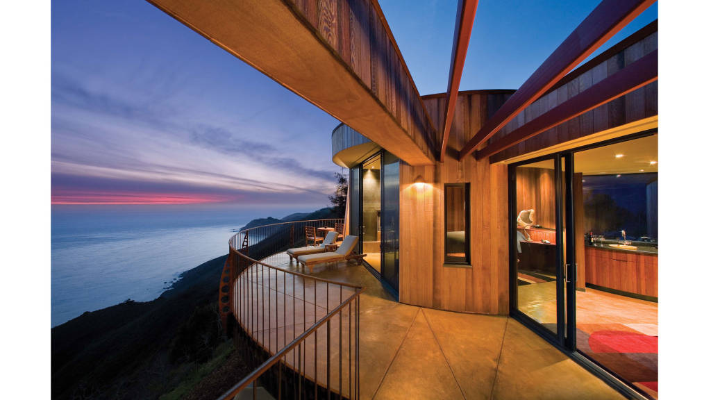 Post Ranch Inn, Big Sur, California โรงแรมนี้แต่งด้วยไม้สีแดงทอดยาวตามหน้าผาหิน คุณจะได้ยินเสียงแร้งที่ปลายหาดอีกด้วย ราคาต่อคืน 1,350 ดอลล่าร์ รวมอาหารเช้า