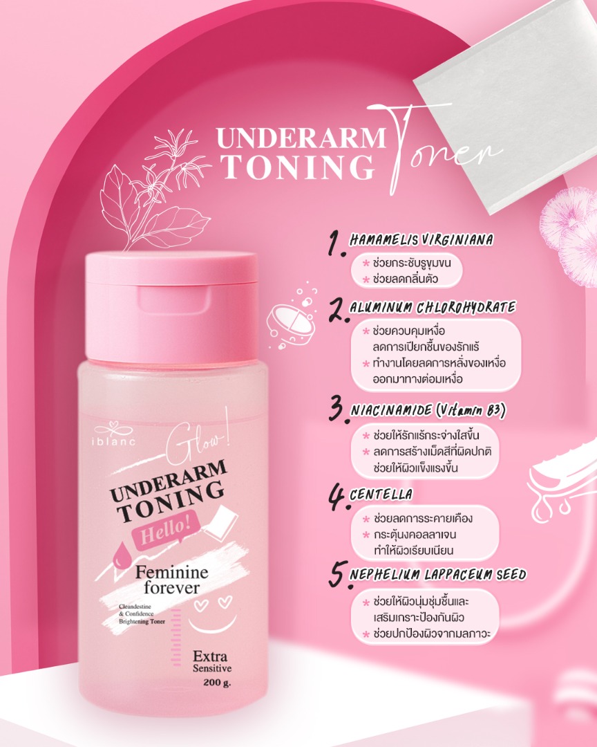 แต่ถ้าสาวๆ อยากโชว์ผิวใต้วงแขนแบบมั่นใจไม่กลัวโป๊ะ ก็ต้องเคลียร์คัทปัญหาผิวกวนใจให้ตรงจุด โดยเฉพาะรอยดำคล้ำ ตุ่มหนังไก่ และกลิ่นตัว ที่คอยวนลูปแย่งซีนให้รู้สึกเสียเซลฟ์อยู่เสมอ แม้ปัญหานี้ดูเหมือนจะแก้ยากแต่แก้ได้ ถึงเวลาเปิดไฟใส่ฟิลเตอร์ให้ใต้วงแขนสว่างกระจ่างใส โชว์งานผิวปั๊วปังแบบไม่ต้องง้อเลเซอร์ ด้วยผลิตภัณฑ์ลดเหงื่อระงับกลิ่นกาย “ไอบลองก์ อันเดอร์อาร์ม โทนนิ่ง (iblanc Underarm Toning)” โทนเนอร์ที่ถูกออกแบบมาให้มีเนื้อสัมผัสบางเบา ซึมไว ไม่เหนียวเหนอะหนะ