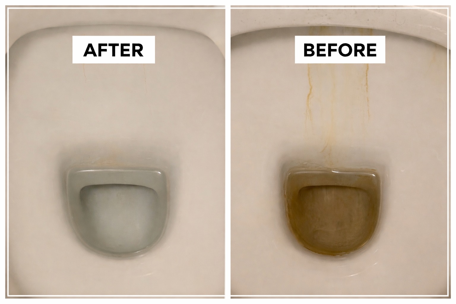 จากภาพเปรียบเทียบก่อนและหลังการทำความสะอาด พบว่าคราบสีน้ำตาลเข้มที่เกาะตัวเป็นทางยาวตามผนังโถและคราบหนาที่ก้นโถส้วมหายไปจนหมดสิ้น เหลือไว้เพียงผิวเซรามิกที่ขาวสะอาดเงางาม โดยเฉิน อิ้งหรู อธิบายว่าคราบลักษณะนี้มักเกิดจาก "น้ำกระด้าง" ซึ่งเป็นตะกอนแร่ธาตุที่มีคุณสมบัติเป็นด่าง