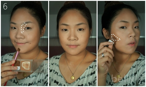 ปัดให้ทั่วบริเวณกรอบหน้า หน้าผาก ข้างแก้ม กราม ตามที่วงไว้ ใบหน้าจะดูมีมิติขึ้นมาสเต็ปนึง