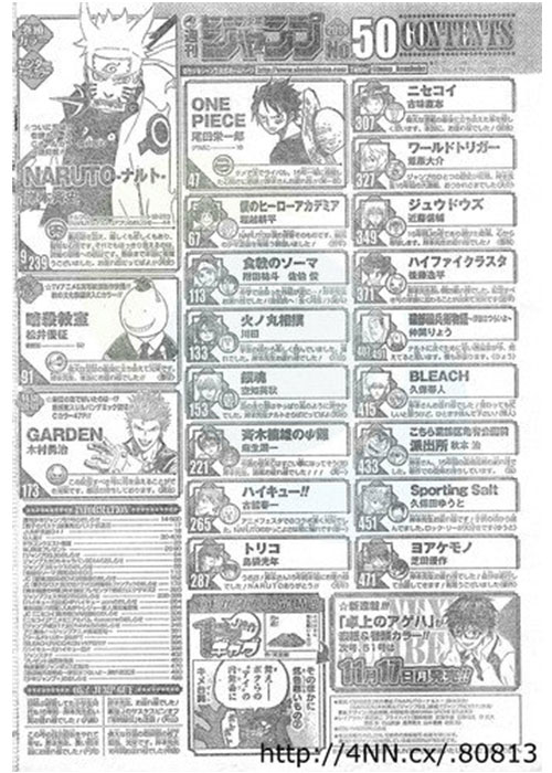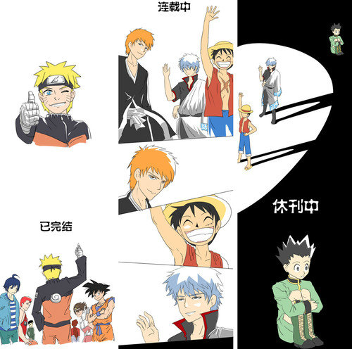 ส่งท้ายกันด้วยภาพนี้ จะเห็นว่านารูโตะ เดินเข้าร่วมกลุ่มการ์ตูนในตำนานที่จบไปแล้ว โดยมีเรื่องที่ยังไม่จบโบกมืออำลา ในขณะที่ดันมีเรื่องนึงที่อู้งานอยู่ช่วงนี้เลยไม่ได้มาอำลาด้วย