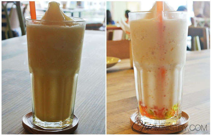 อันดับแรกลองชิมเครื่องดื่มrecommend ที่แนะนำสำหรับสาวๆเลยครับ เป็นสมูทธี้สูตรสลายไขมัน ซึ่งมีส่วนผสมของส้ม สัปปะรด ขิง และเพิ่มความสดชื่นด้วยสูตรโยเกิร์ตเยลลี่ เลือกได้สองรสชาติสองอารมณ์ครับ