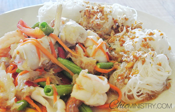 ถัดมาเป็นตำเกาเหลาหมี่ลวก จานนี้ก็แซ่บไม่น้อย มีทั้งกุ้ง หมึก ปู และหมี่ก้อน ดูจากสีสันแล้วน้ำลายไหลว่าไหมครับ