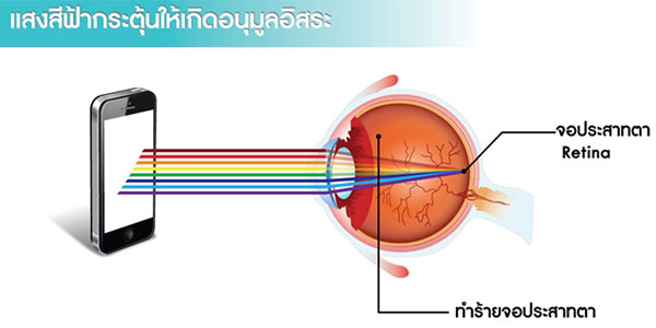 จากงานวิจัยทางการแพทย์พบว่า แสงสีฟ้า (Blue Light) นั้นมีพลังงานมากพอที่จะทำให้เกิดสารอนุมูล อิสระภายในลูกตาซึ่งจะทำให้เซลล์ประสาทตาตายได้ และก่อให้เกิดโรคจอประสาทตาเสื่อม และที่ สำคัญโรคนี้ไม่สามารถรักษาให้หายได้อีกด้วยค่ะ