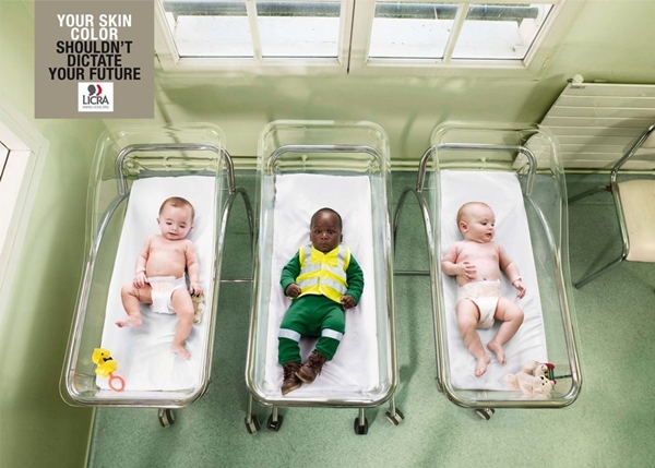 “สีผิวไม่ได้บ่งบอกถึงอนาคต” (France, 2013)ต่อต้านการเหยียดสีผิว ที่คนบางกลุ่มยังยัดเยียดให้คนผิวสีทำงานใช้แรงงาน
