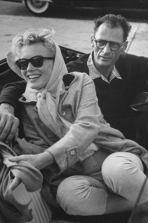 รอยยิ้มสดใสขณะที่นั่งอยู่บนรถยนต์กับสามี Arthur Miller เดือนกรกฎาคม 1956