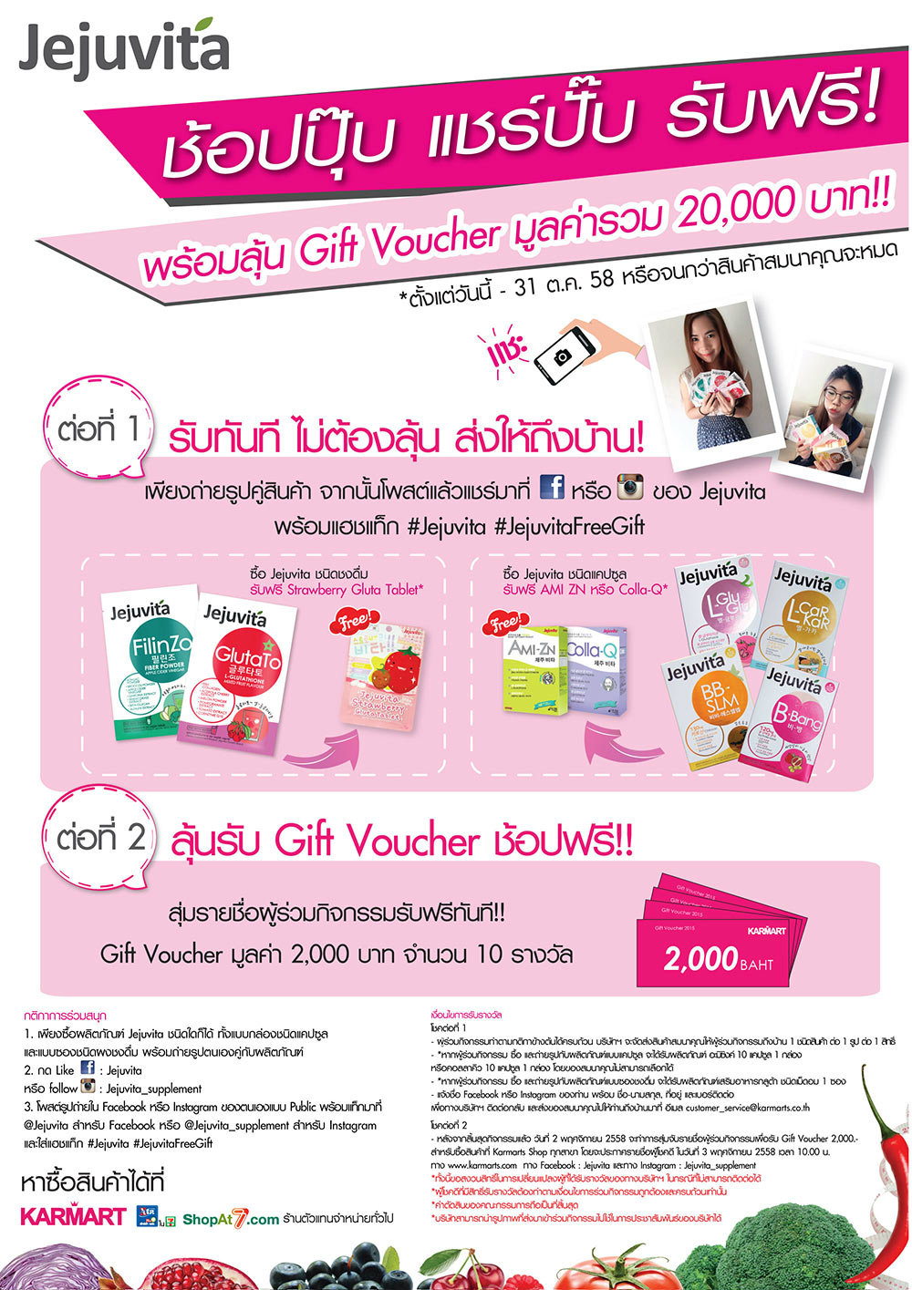 1. ซื้อผลิตภัณฑ์เสริมอาหารแบรนด์ Jejuvita ชนิดใดก็ได้ ที่ 7 Extra ทุกสาขา, Karmarts Shop ทุกสาขา, ตัวแทนจำหน่าย Karmarts ทั่วประเทศ และที่ www.karmarts.com