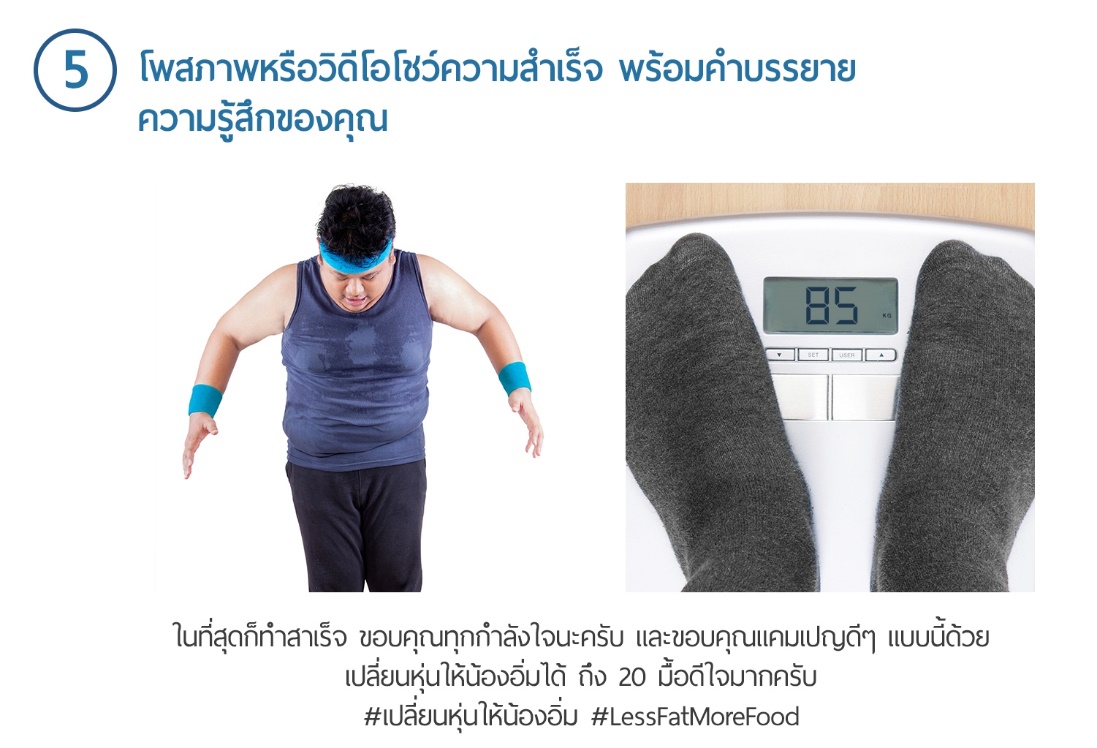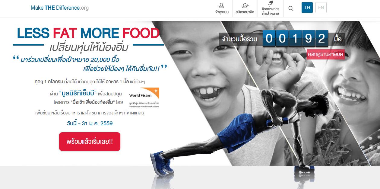 เบื่อ! โดนทักว่าอ้วน อยากหาทางเปลี่ยนแปลงตัวเอง? นี่เป็นโอกาสดีที่คุณจะได้เปลี่ยนตัวเองแล้วล่ะ ใครอยากหุ่นดี สุขภาพดี งานนี้ได้ลูกฮึดเต็มที่ เพราะโครงการ LESS FAT MORE FOOD เปลี่ยนหุ่นให้น้องอิ่ม อยากชวนคุณมาตั้งเป้าลดน้ำหนักเปลี่ยนแปลงตัวเองไปด้วยกัน โดยมีเป้าหมาย 20,000 มื้อ เพื่อช่วยให้น้องๆ ที่ขาดแคลนอาหารได้กินอิ่มกัน มาร่วมกันตั้งเป้าฟิตหุ่นเฟิร์มๆ ไม่ใช่แค่เพื่อตัวคุณเอง แต่ยังช่วยสังคมไปพร้อมๆ กัน เพราะทุกๆ 1 กิโลกรัมที่คุณลดได้ จะเท่ากับคุณได้ให้อาหาร 1 มื้อ แก่น้องๆ ผ่านทาง “มูลนิธิ ทีเอ็มบี” เพื่อสนับสนุนโครงการ “มื้อเช้าเพื่อน้องท้องอิ่ม” โดย World Vision เพื่อช่วยเหลือเรื่องอาหาร และโภชนาการของเด็กๆ ที่ขาดแคลน