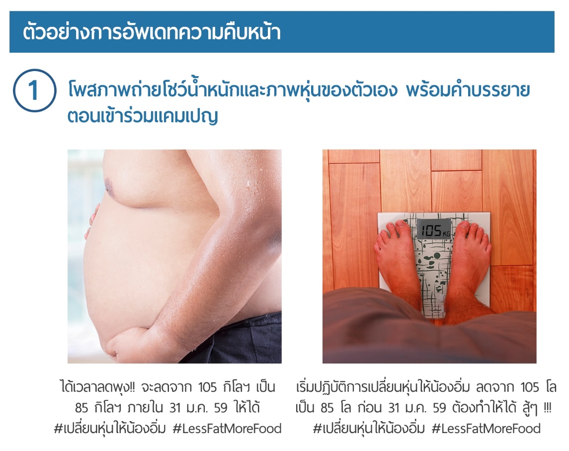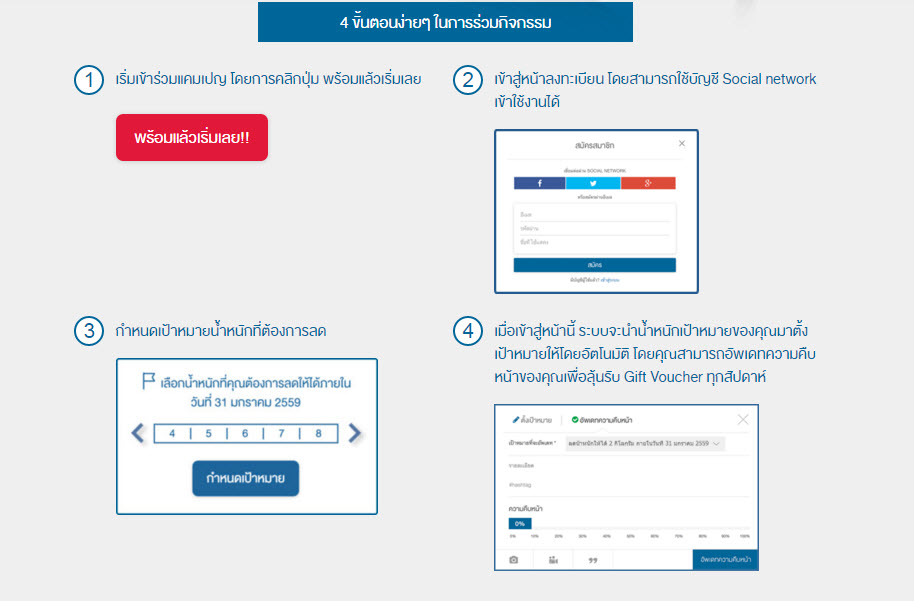 จากนั้นลงทะเบียนก่อน ส่วนใครที่มีบัญชี Social network ก็สามารถใช้บัญชีของตัวเองเข้าใช้งานได้เลย แล้วทำการกำหนดเป้าหมายน้ำหนักที่ต้องการจะลด โดยระบบจะนำน้ำหนักของคุณมาตั้งเป้าหมายให้อัตโนมัติ และยังมีรางวัลให้กับผู้ร่วมกิจกรรมที่มีการอัพเดทความคืบหน้าการลดน้ำหนักอย่างสม่ำเสมอ รวมทั้งมีเนื้อหาที่สร้างแรงบันดาลใจ และเป็นวิธีที่ทำได้จริง โดยมีสิทธิ์ลุ้นรับ Gift Voucher ทุกสัปดาห์!