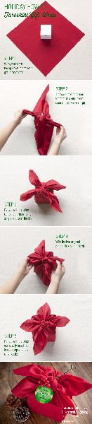 วิธีแรกคือเอาผ้าหรือเสื้อเก่าๆ มาห่อโดยวางของขวัญไว้ตรงกลาง หยิบมุมผ้าฝั่งตรงมาผูกกันเป็นเงื่อนหนึ่งครั้งแล้วทำซ้ำกับมุมผ้าตรงข้ามที่เหลือ จากนั้นผูกเงื่อนซ้ำกับมุมตรงข้ามคู่แรกและต่อด้วยคู่สองก็จะได้เงื่อนเก๋ๆ ปิดท้ายกับการตกแต่งด้วยผลเบอร์รี่และกิฟต์แท็ก