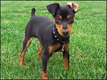 มาตราฐานสายพันธุ์ อุปนิสัย : ฉลาด ร่าเริง ตื่นตัวอยู่เสมอ กล้าหาญ ซื่อสัตย์ รักเจ้าของ ชอบเห่า ศีรษะ : มีขนาดสัมพันธ์กับขนาดของลำตัว หัวกะโหลกแบน หัวกะโหลกระหว่างหูจะเล็กสู่โคนปาก หู : โคนอยู่ในระดับสูง หูอาจจะตัดและดามให้ตั้งหรือไม่ตัดหูก็ได้ ตา : ค่อนข้างโต เป็นรูปกลมรี ตาสีดำ ขอบตาสีดำ ยกเว้นสีช็อคโกแลต ขอบตาจะมีช็อคโกแลตด้วย ดั้งจมูก : มีมุมหักเล็กน้อย ปาก : มีลักษณะแข็งแรงมาก มีขนาดสัมพันธ์กับส่วนหัวสันปากจะขนานกับสันของหัวกะโหลก ริมฝีปากและแก้มมีขนาดเล็ก จมูก : สีดำ ยกเว้นสุนัขที่มีสีช็อคโกแลต จมูกจะมีสีช็อคโกแลตด้วย ฟัน : ขบแบบกรรไกร ลำตัว : ค่อนข้างสั้นเพศผู้ความสูงของลำตัวมีขนาดเท่ากับความยาวของลำตัว ส่วนเพศเมียจะยาวกว่าเล็กน้อยเส้นหลังตรงอาจจะอยู่ในแนวระดับหรือเอียงสู่บั้นท้ายก็ได้ คอ : มีขนาดสัมพันธ์กับขนาดของหัวและลำตัว คอมีลักษณะกลมประกอบด้วยกล้ามเนื้อ หนังคอตึง คอตั้งเชิดสง่า ลำตัวส่วนหน้า : หัวไหล่ ลาดเอียง กระดูกหัวไหล่ทำมุมพอเหมาะเพื่อให้การเดินมีลักษณะคล้ายม้าย่อง อก : ลึกจรดข้อศอก ขาหน้า : กระดูกขามีขนาดปานกลาง แข็งแรง มองจากด้านหน้าขาหน้าทั้งสองตรงตั้งฉากกับพื้น ขาหน้าทั้งสองห่างกันพอเหมาะข้อเท้าหน้าแข็งแรงตั้งฉากกับพื้น เท้าเล็กคล้ายแมว เท้าหน้ากลม เล็บหนา นิ้วติ่งควรตัดออก เอว : สั้น แข็งแรง สะโพก : มีความสูงใกล้เคียงกับระดับเส้นหลัง ขาหลัง : ท่อนบนประกอบด้วยกล้ามเนื้อ ข้อเท้าแข็งแรงทำมุมพอประมาณข้อเท้าหลังสั้นทำมุมตั้งฉากกับพื้น เมื่อมองจากด้านหลัง ขาหลังตั้งตรง ขนานห่างกันพอเหมาะ เท้าหลังมีลักษณะเหมือนเท้าหน้า หาง : โคนหางอยู่ในระดับสูง นิยมตัดหาง ขน-สี : ขนสั้นแข็ง ขนสีแดงดำทั้งตัว ดำ-แดง,ช็อคโกแลต-แ ขนาด : เป็นสุนัขที่มีขนาดเล็ก ส่วนสูง : ประมาณ 10-12.5 นิ้ว การเดิน-วิ่ง : มีลักษณะคล้ายม้าย่อง ยกเท้าสูง มองจากด้านหน้า-หลัง ขาหน้า-หลัง ตรงไม่บิดงอ ขณะเดินคอเชิดหางตั้ง ข้อบกพร่อง : สีผิดปกติ เตี้ยหรือสูงกว่ามาตรฐาน