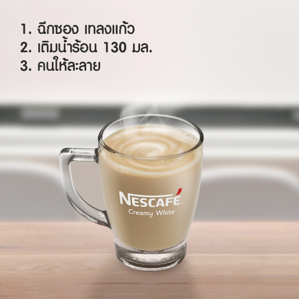 แค่ฉีกซองเนสกาแฟ ครีมมี่ ไวท์ เทลงในแก้ว เติมน้ำร้อน 130 มล. แล้วคนให้ละลาย