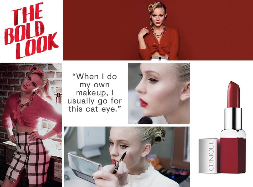 - Country : สีปากต้องโดดเด่น เข้ม สร้างความมั่นใจ (Bold) เพื่อให้ดูมีพลังดึงดูด เหมาะกับ Clinique Pop Lip Color & Primer สี Cherry Pop ซึ่งเข้ากับอายไลเนอร์ และการแต่งตาที่โฉบเฉี่ยว