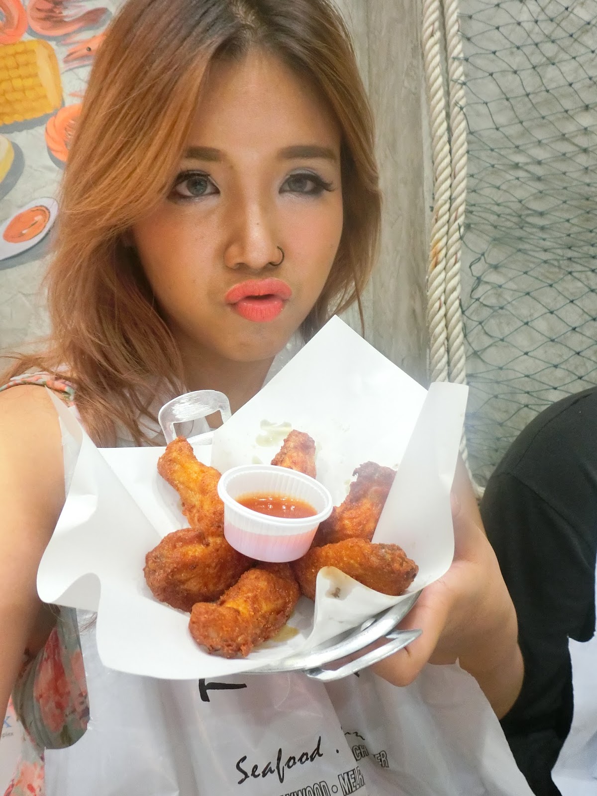 เพื่อให้ได้บรรยากาศแบบหลุยเซียน่าจริงๆ ร้านนี้เค้าจะทานด้วยมือ แน่นอนต้องใช้มือทานถึงจะฟินมากก แต่ยังไงก็มีถุงมือให้ใส่นะ สำหรับคนที่ไม่อยากใช้มือจริงๆ เค้าจะมือผ้ากันเปื้อนมาให้ และเมนูแรกที่มาถึงคือ ปีกไก่ทอด FRIES WEST COAST WINGS (120บาท)
