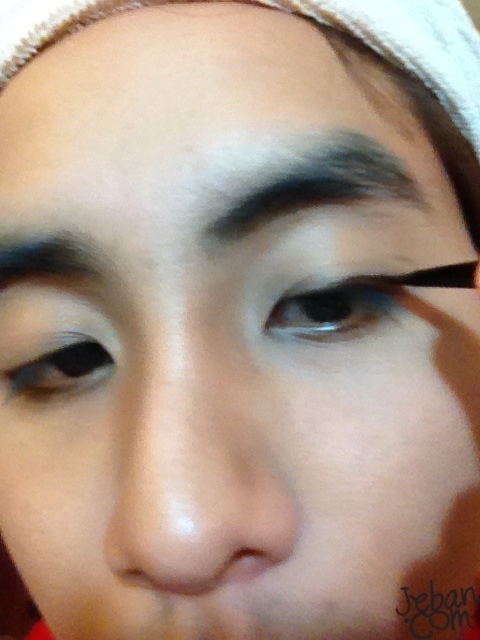 ต่อมาเราก็จะมาเขียนไลน์เนอร์ตากันครับ โดยผมจะเขียนให้มีความหนาหน่อยและชี้ขึ้นเล็กน้อยเพราะผมเป็นคนตาตกและหนังตาหลบในไม่เท่ากัน(พิการซ้ำซ้อนสินะ T^T) ก็เลยใช้การเขียนอายไลน์เนอร์เข้าช่วยผมใช้ Maybelline Gel Linerสีน้ำตาล กับแปรงที่เค้าแถมมาให้แหละครับ โดยเริ่มจากกลางตาออกหางตาก่อนแล้วค่อยแต่งตรงกลางไปหัวตาเพื่อความสวยและความเป็นธรรมชาติ ไม่ต้องรีบร้อนนะครับเดี๋ยวจะเป็นหลินปิงเอา= w =นอกจากนั่นผมเขียนตาล่างให้ดูคมยิ่งขึ้นด้วยนะครับ จะได้ออกมาเป็นแบบในภาพเมื่อเขียนตาเสร็จแล้ว
