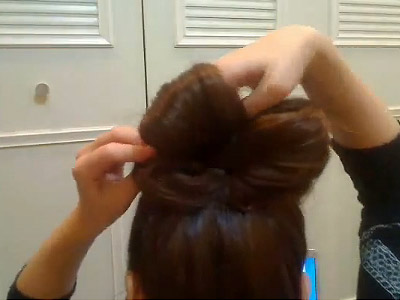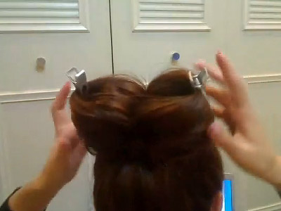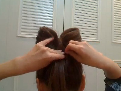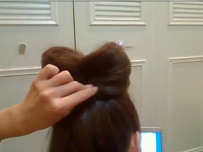 ขั้นตอนที่ 3 เอาผมที่เหลือจากการมัดจากขั้นตอนที่ 2 มายีแล้วม้วนเก็บเข้าไปในตัวของผมที่เป็นส่วนของโบว์ แล้วติดกิ๊บให้เรียบร้อย